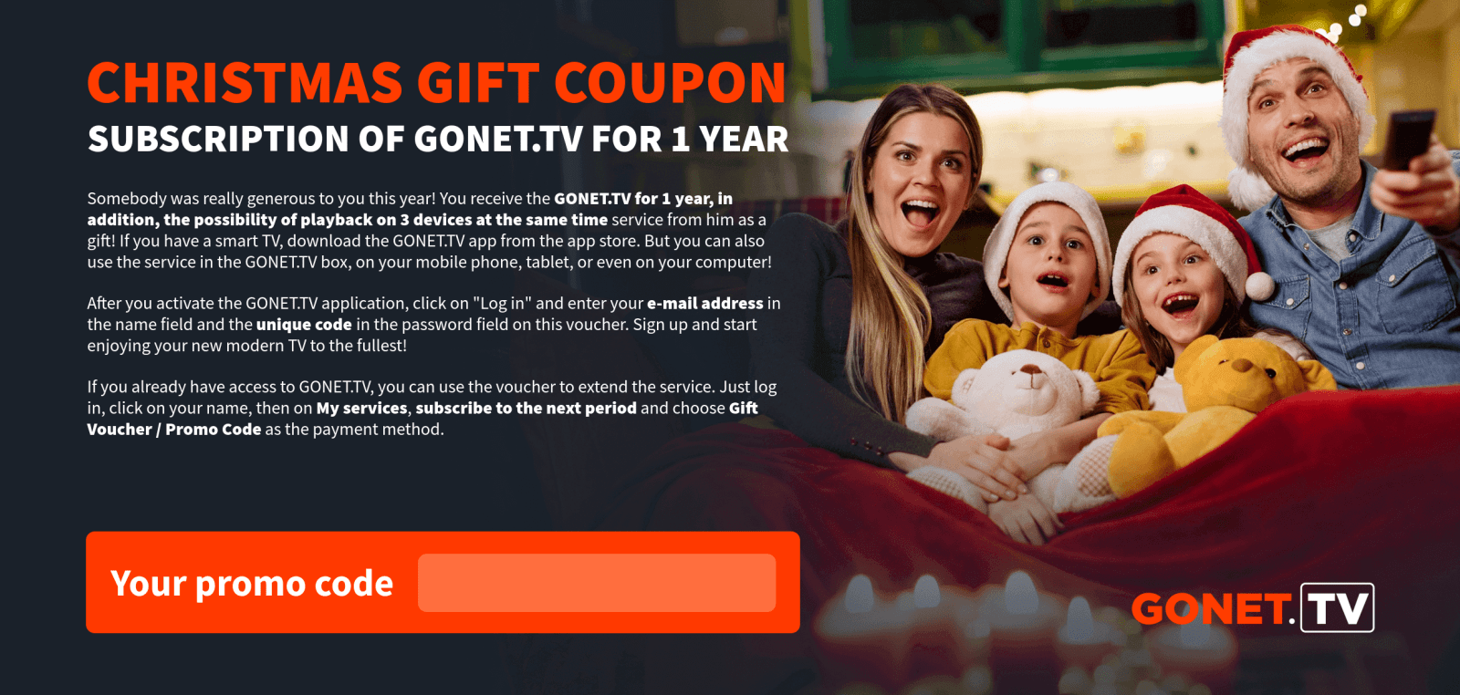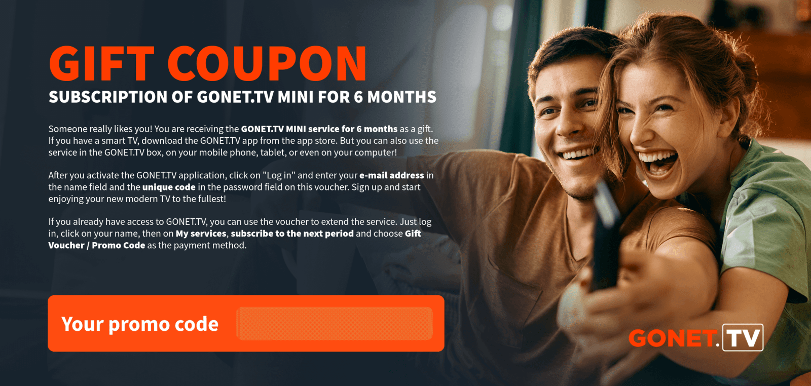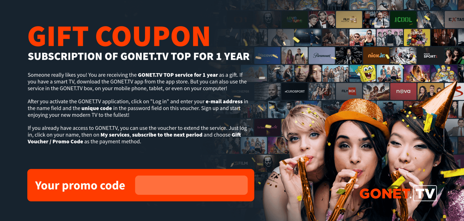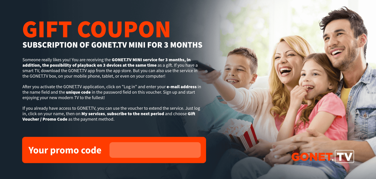 As soon as we receive your payment, the GONET.TV service will be activated and we will inform you of the activation by e-mail.