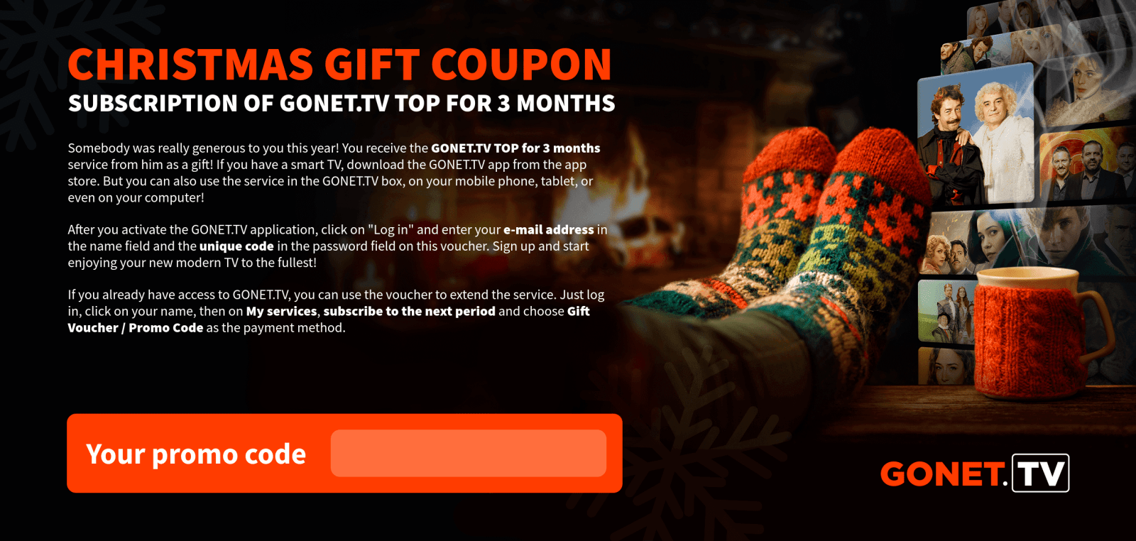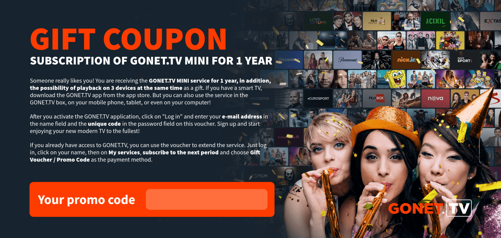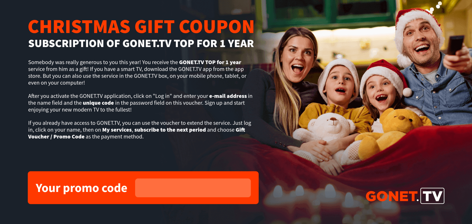 As soon as we receive your payment, the GONET.TV service will be activated and we will inform you of the activation by e-mail.
