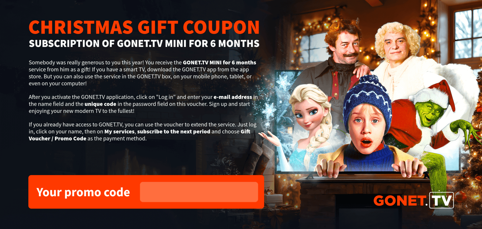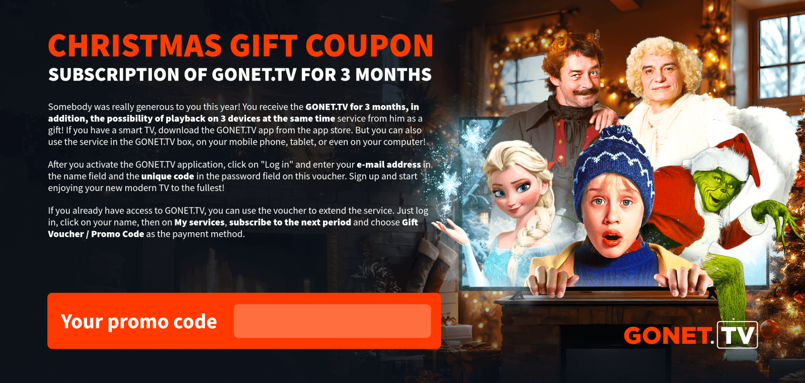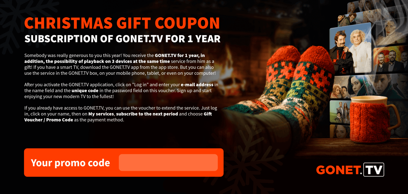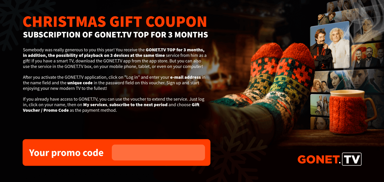 As soon as we receive your payment, the GONET.TV service will be activated and we will inform you of the activation by e-mail.